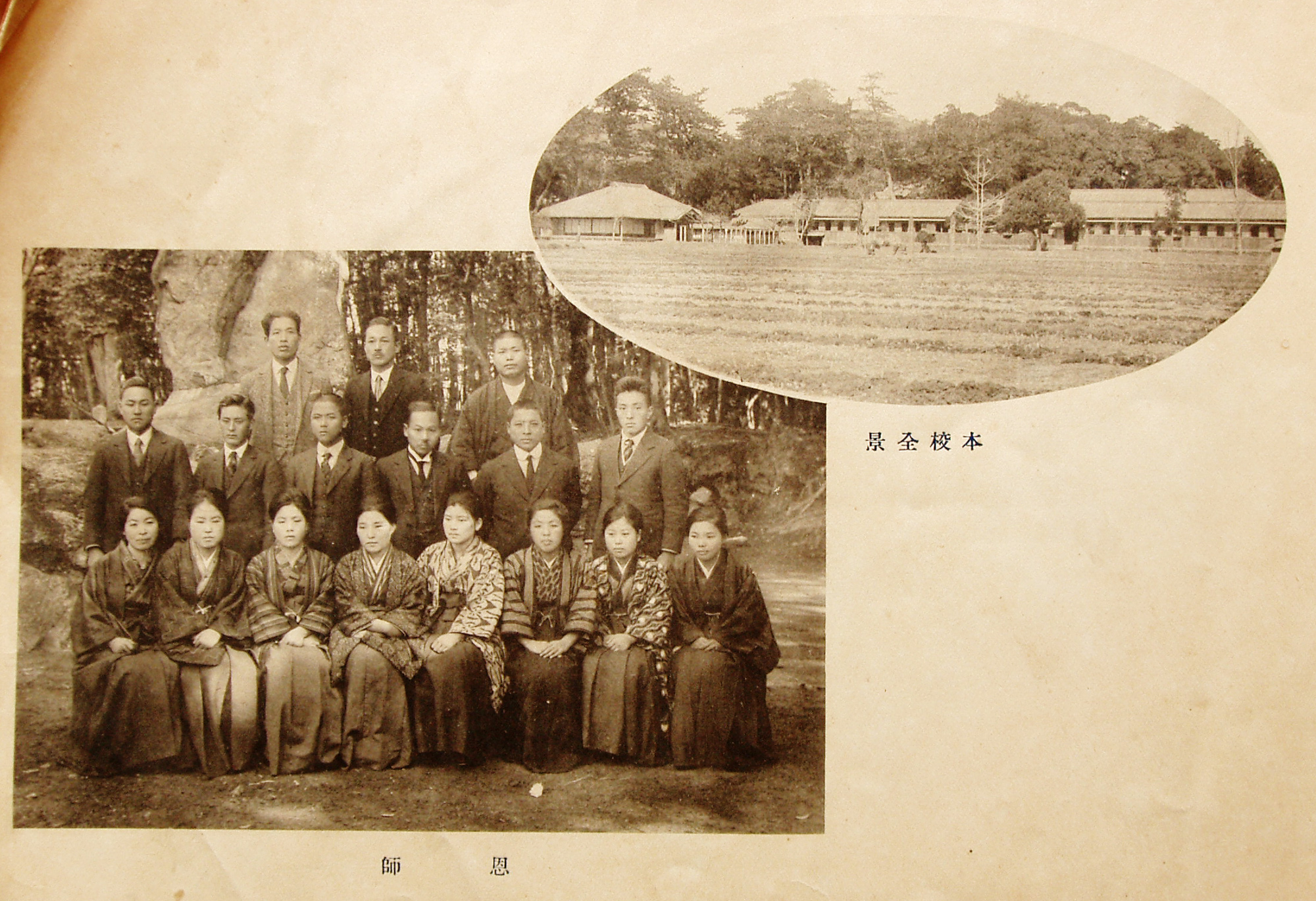 教員時代、昭和2年(1927)3月夜須尋常高等小学校の「卒業記念」より (弥太は、恩師の写真の後列左端) この記念写真は、 高知県香美郡夜須尋常高等小学校と 同 村立女子農業補修学校の合同記録 (岡本龍太所蔵、by IAM) |